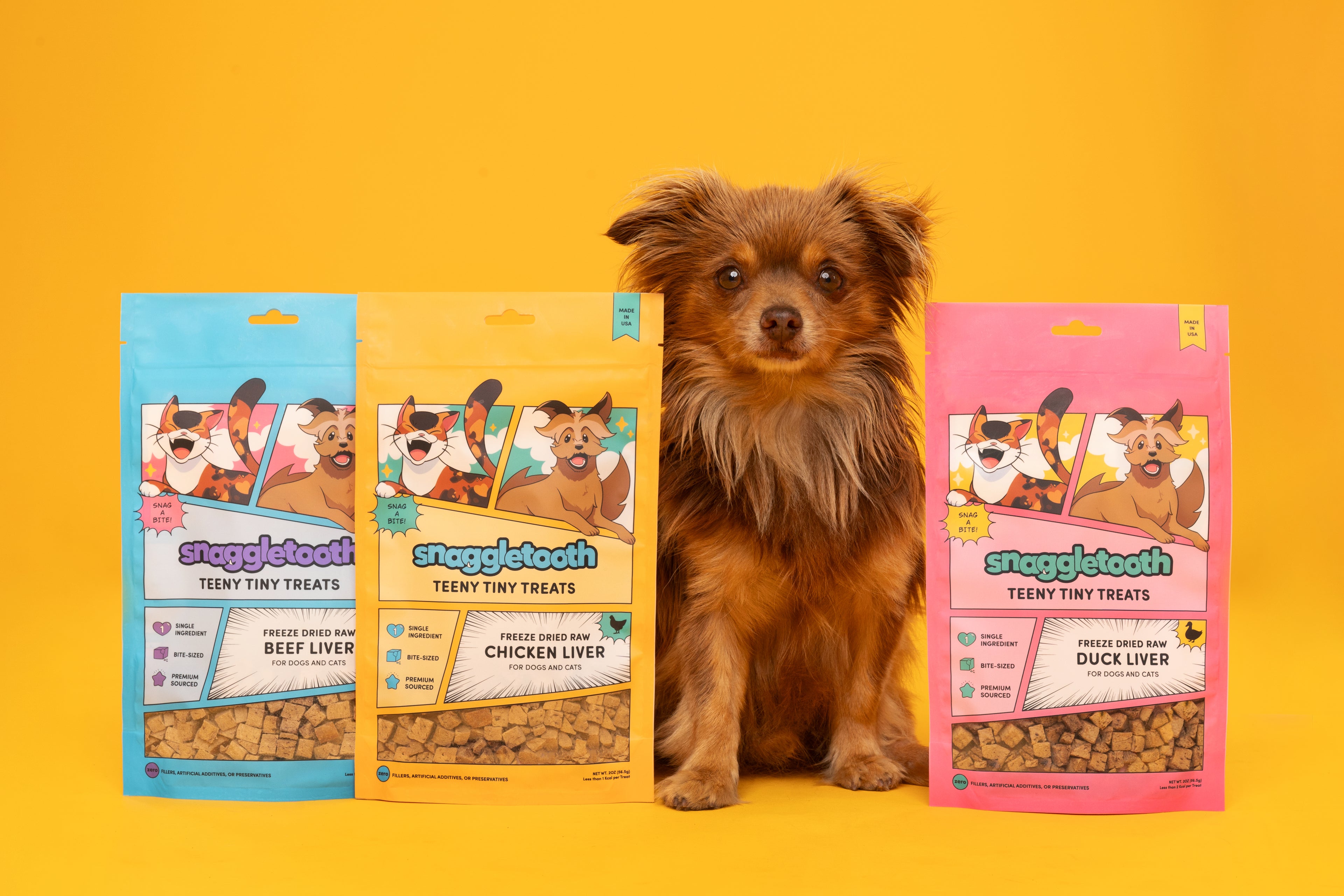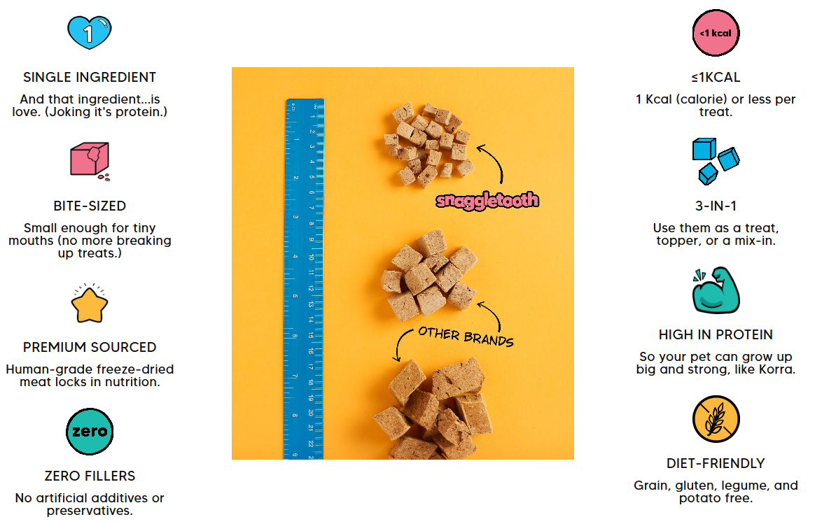 Snaggletooth's freeze dried treats are less than 1 calorie each & 100% made in USA with human-grade proteins.